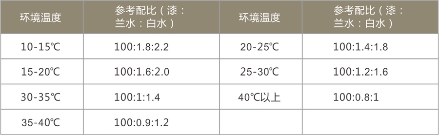 在實際施工中可根據(jù)實際情況參考以下配比,相對濕度在75%以下時,配漆為: